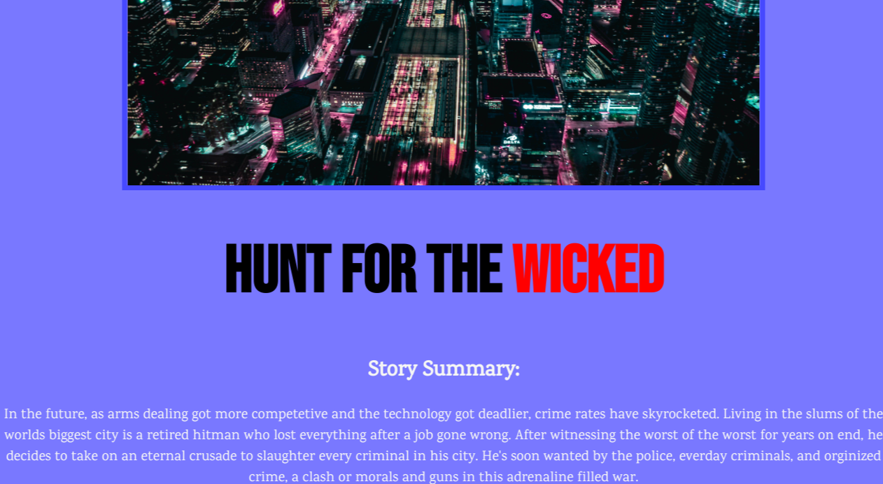 The goal was to use basic HTML and basic CSS to create a webpage for a made up movie. I made this with my partner Andrea. We both didn't know what genre we wanted so I just said "action" and we went with that. We made a planning page so we know what to do and so we meet all the requirements, the story and title for the movie was not conceived until the end, all we planned was how the webpage was going to look. Since I was on story duty, I came up with a retired hitman who cleans the city by slaughtering its criminals in a futuristic setting.